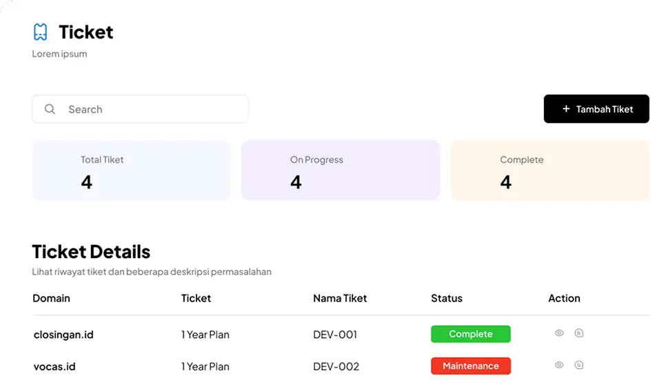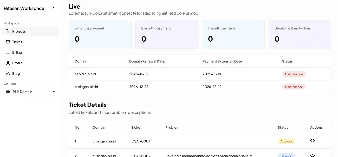 Kelola konten, pantau progres, cek status live, sampai kirim tiket support semua di satu tempat.